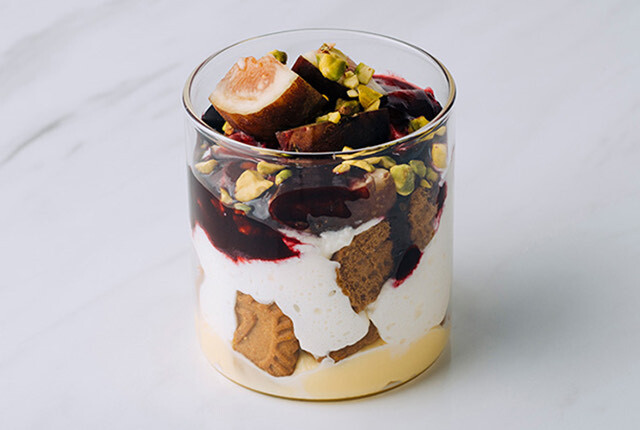 まろやかなカスタードクリームとマスカルポーネクリームをベースに、カラメル風味のシナモンクッキー、きゅっと酸味のきいたカシスソース、食べごろの無花果と巨峰、砕いたピスタチオをのせて、様々な食感、味わい、香りが織りかさなった、秋を味わうプディングが登場しました。