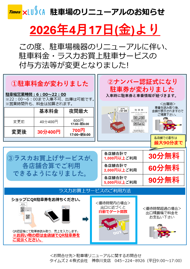 駐車料金とラスカ内でのお買上駐車サービスの付与方法などが変更となります。