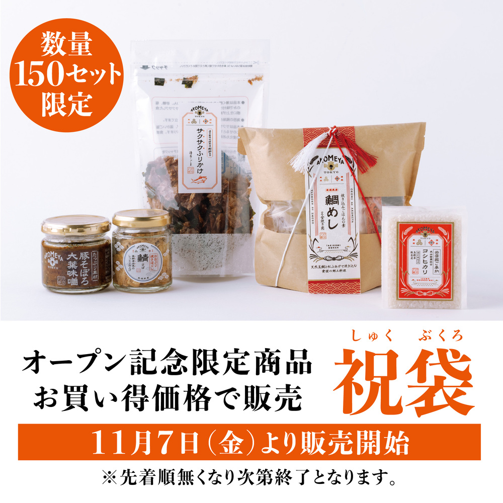 AKOMEYA TOKYOの”食”を語るうえで外すことの出来ない、人気の定番商品5点が入った、「AKOMEYA TOKYO ラスカ茅ヶ崎」のオープン記念”祝袋”。皆さまへご挨拶の気持ちを込めて限定価格、数量限定で販売。