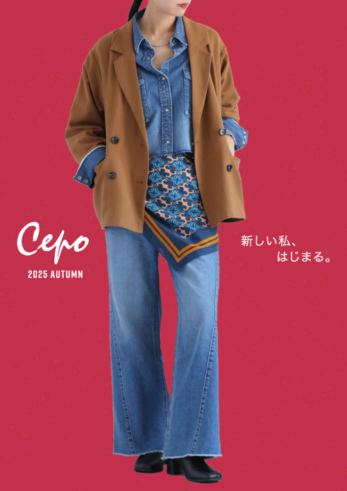 ‘‘DENIM‘‘ ‘‘WORK‘‘ ‘‘MILITARY‘‘ をスタイリングのベースに、今の気分をMIXした大人のカジュアルブランド。Cepoの強みのデニムを中心としたスタンダードでカジュアルな女性らしいスタイリングを提案します。