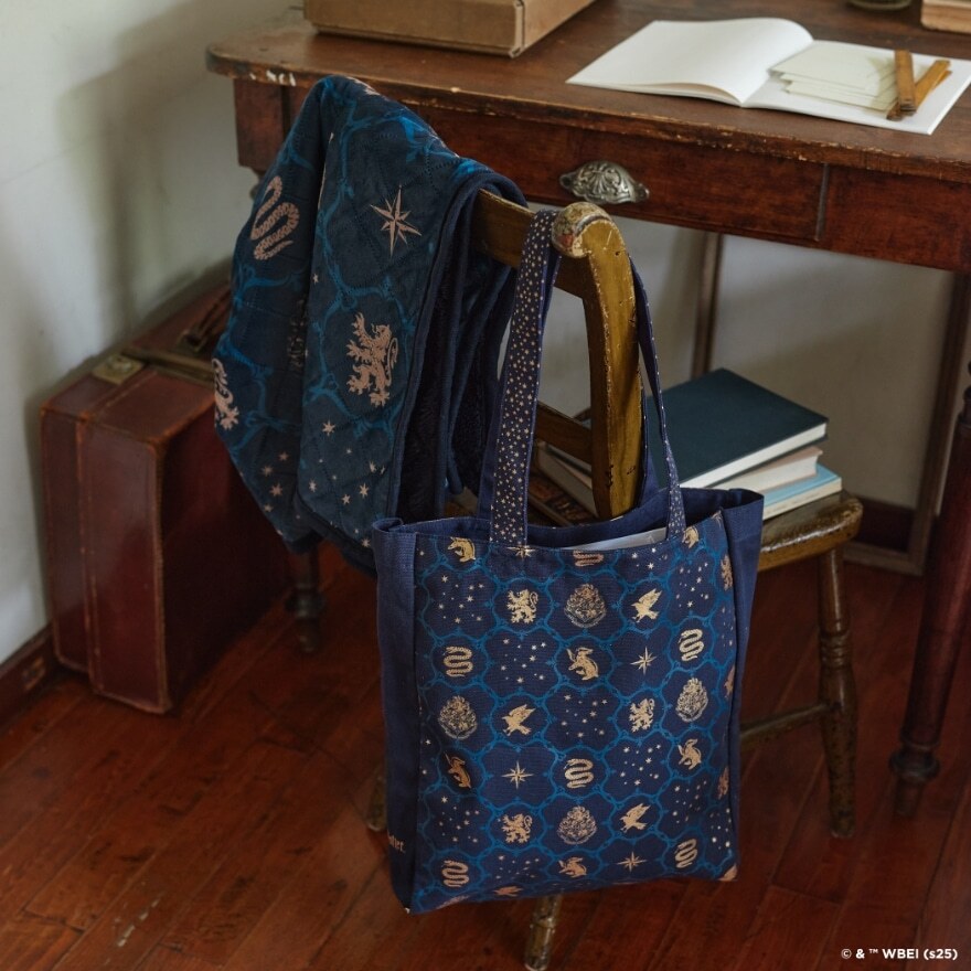 日常使いしやすい、寮章デザインのトートバッグやブランケット。トートバッグは、マチ付きでA4サイズもすっぽり。荷物が多いときにも安心なサイズ感です。