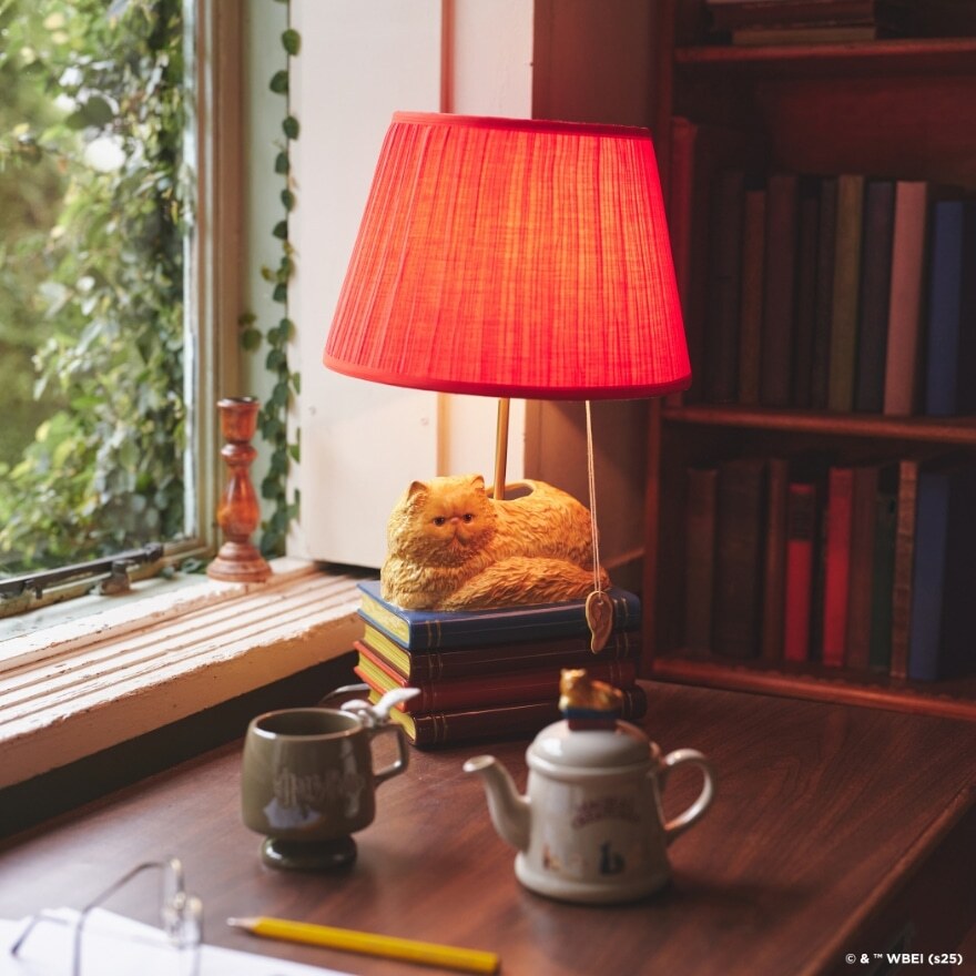 積み重なった本の上に佇むクルックシャンクスが愛らしい卓上ランプ。お部屋を優しく照らしてくれます。