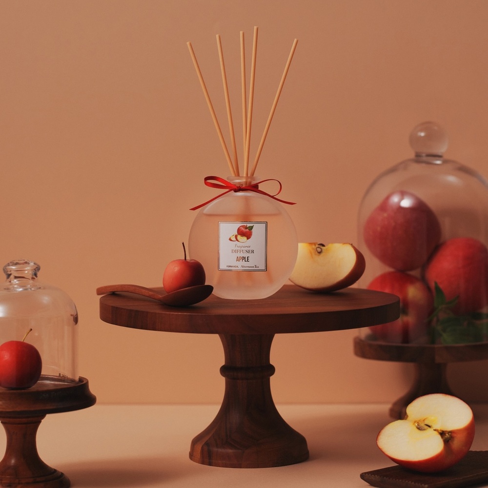 優しいピンク色が可憐な印象のディフューザー。フレッシュな皮付きリンゴの清々しい香りがお部屋に広がります。