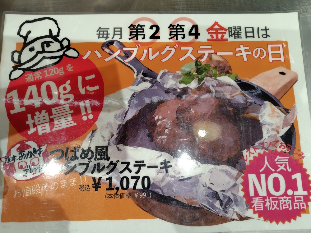 つばめグリルDELI 毎月第2第4金曜日は、ハンブルグステーキ増量日