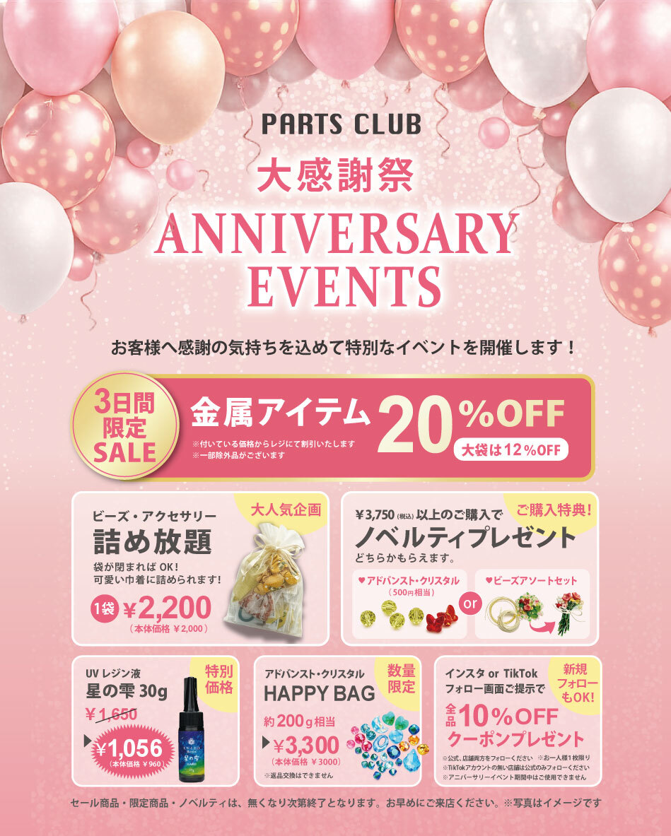HOMEショップニュース【パーツクラブ】2026年04月の記事一覧 SHOP NEWS 4F パーツクラブ パーツクラブ ビーズ・アクセサリー 2026年04月の記事一覧 2026年04月 2026.04.17 パーツクラブ 【アニバーサリーイベント】 2026-04-17~2026-04-27 4F | パーツクラブ 2026.04.01 ☆4月ワークショップのお知らせ☆ 2026-04-01~2026-05-01 4F | パーツクラブ MORE