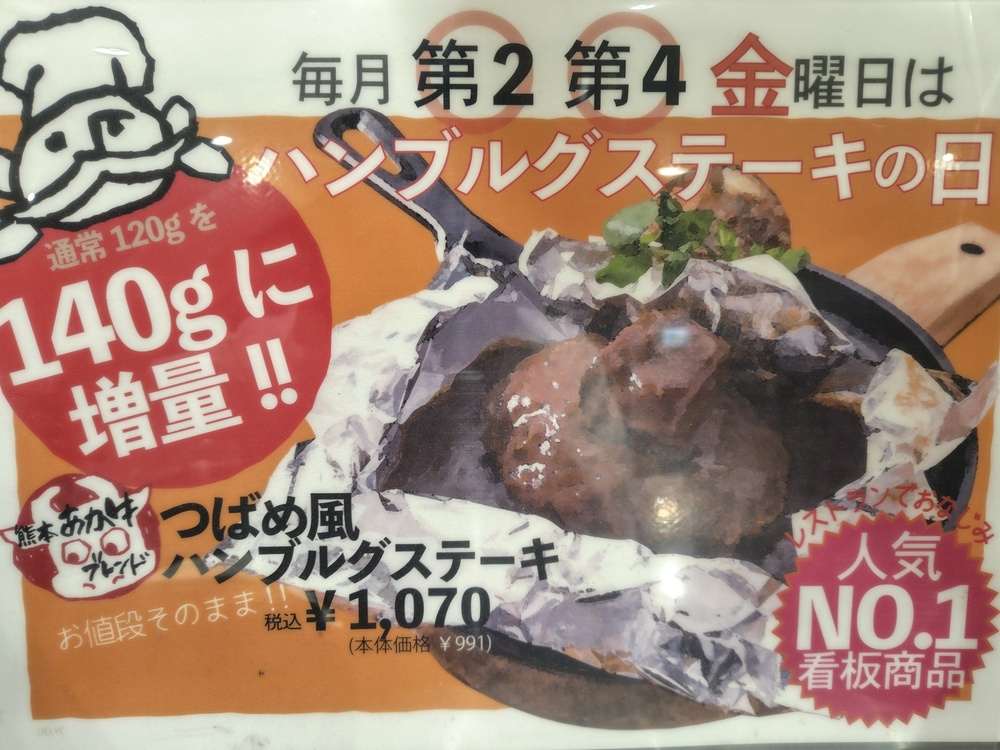 つばめグリルDELI 毎月第二第四金曜日は、つばめ風ハンブルグステーキ増量日