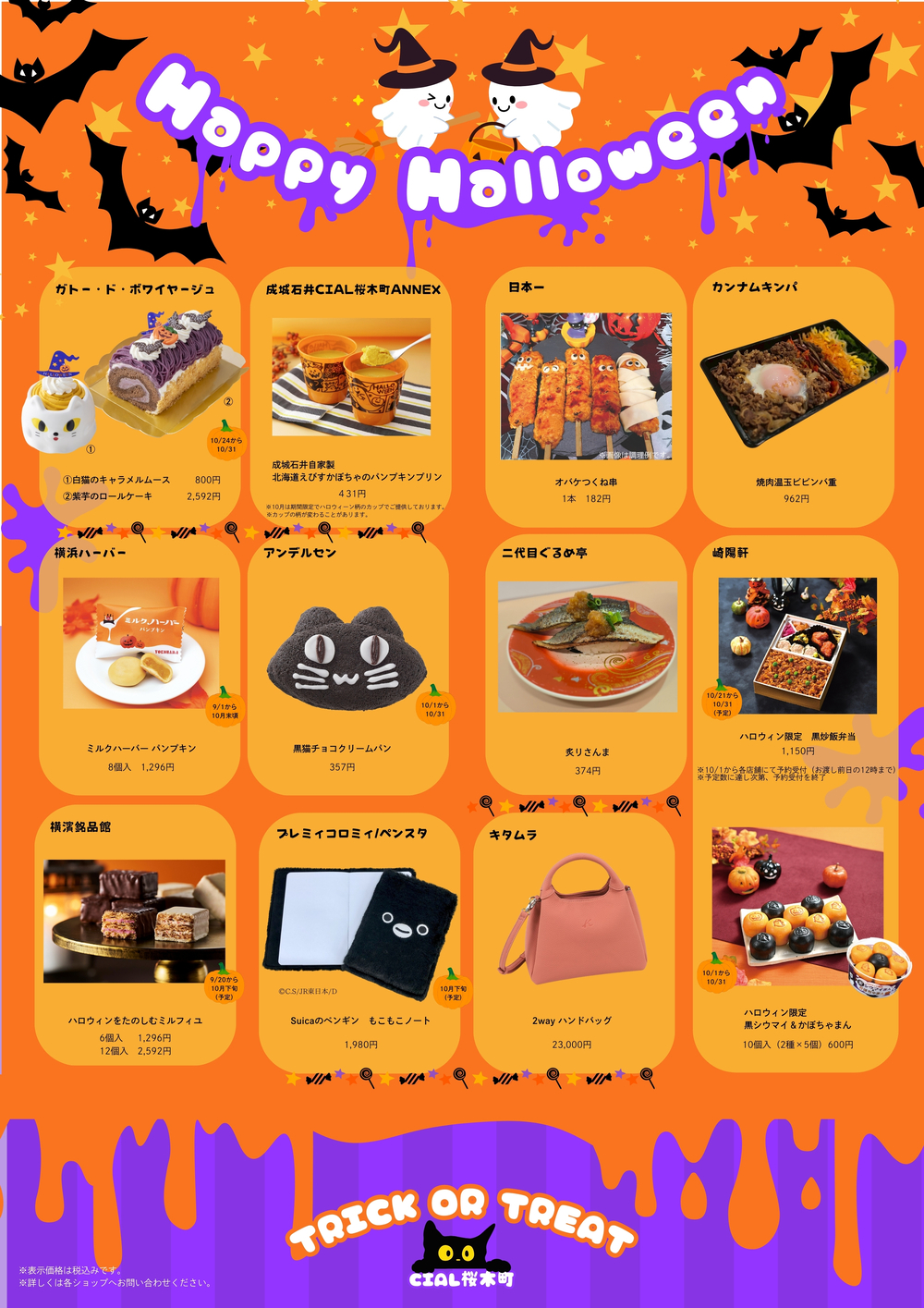 NEWS & EVENT ニュース&イベント HOME ニュース&イベント 🎃 Happy Halloween 開催中!🎃 2025.10.01 開催期間:~2025.10.31 🎃 Happy Halloween 開催中!🎃 CIAL桜木町ではただいま、ハロウィン気分を盛り上げる限定フェアを開催中! かわいいおばけスイーツやこの季節だけの限定メニューが登場しています。 プレゼントにぴったりなスイーツや雑貨、家族みんなで楽しめるグルメも勢ぞろい。 お気に入りを見つけて、ハロウィンを楽しもう🎃✨ 前の記事へ 一覧に戻る
