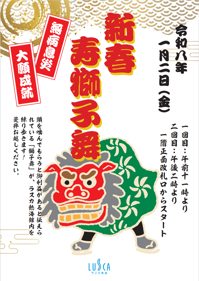 頭を噛んでもらうと御利益があると伝えられている「獅子舞」がラスカ熱海館内を練り歩きます!