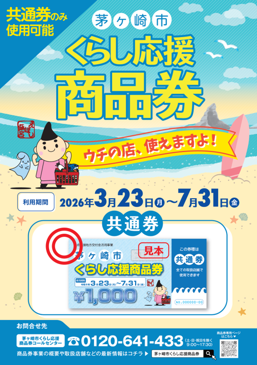 HOMEニュース&イベント茅ヶ崎市 くらし応援商品券 NEWS & EVENT 2026.04.08 開催期間:2026.03.23~2026.07.31 茅ヶ崎市 くらし応援商品券 茅ヶ崎市内で利用できる「茅ヶ崎市くらし応援商品券」について、ラスカ茅ヶ崎で使用可能なのは青色の「共通券」です! 使用期間:2026年3月23日(月)~7月31日(金) 商品券の取扱店舗は下記のHPからご確認くださいませ。 茅ヶ崎市 くらし応援商品券特設ページ アクセスはこちら 【お問い合わせ先】 茅ヶ崎市くらし応援商品券コールセンター ☎ 0120-641-433 受付時間: 9:00〜17:30(土曜・日曜・祝日を除く) 詳細はこちら 前の記事へ 次の記事へ 一覧に戻る