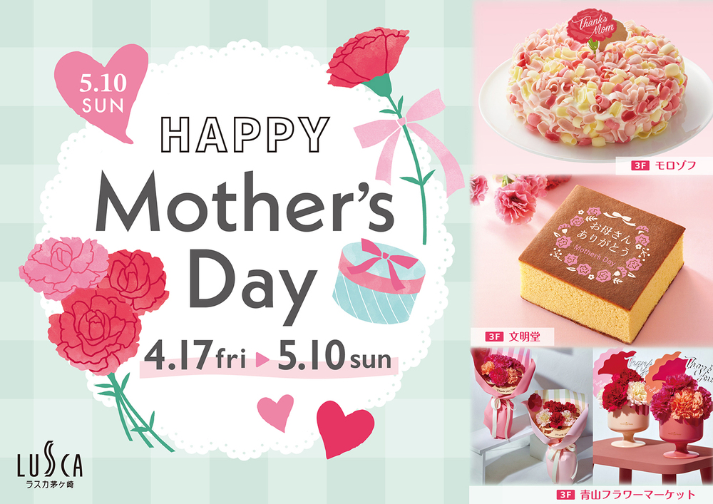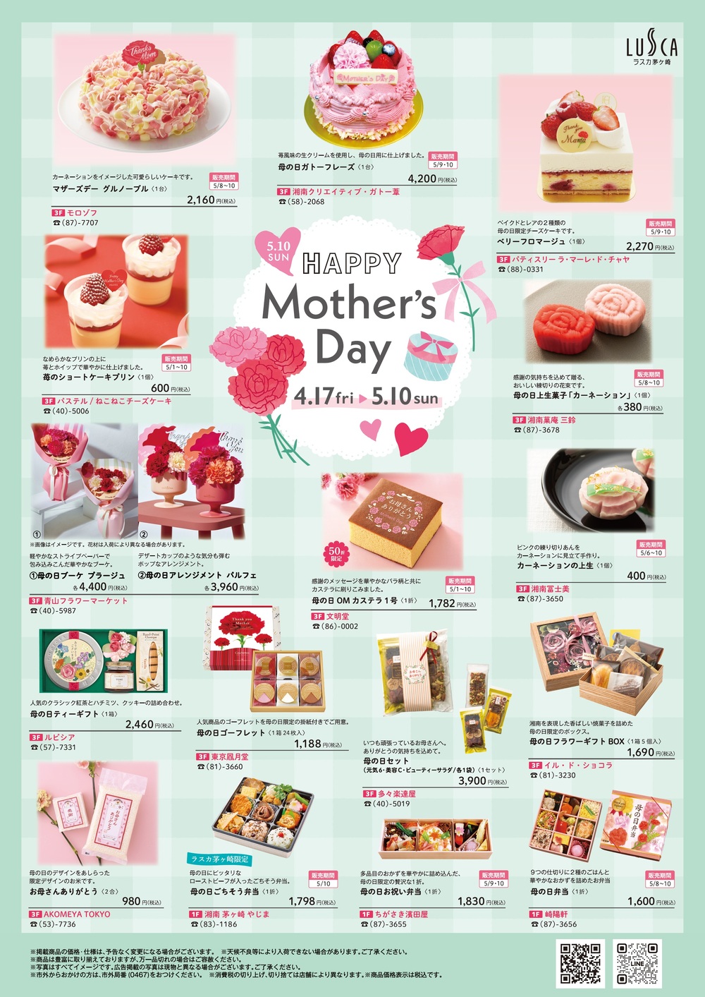 ラスカ茅ケ崎では、フラワーアレンジメントをはじめ、ケーキや焼き菓子など、母の日におすすめの商品を豊富に取り揃えております。