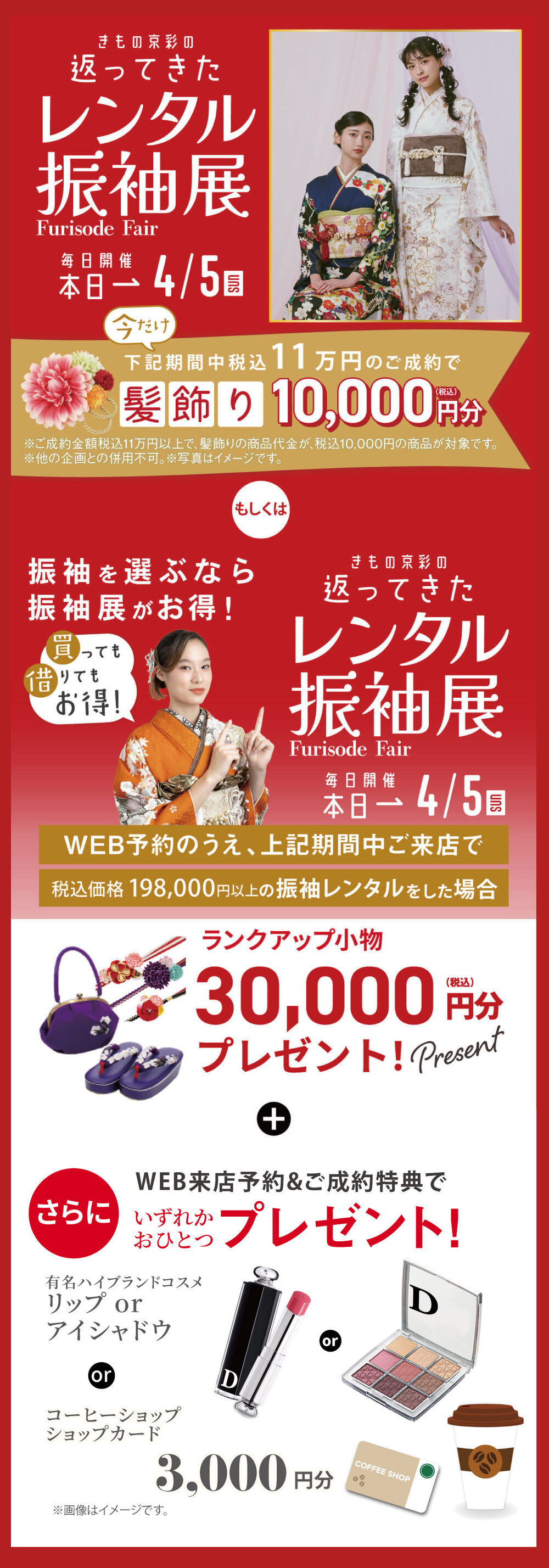 開催中、11万円(税込)以上ご成約の方に、振袖髪飾り10,000円(税込)分プレゼント!