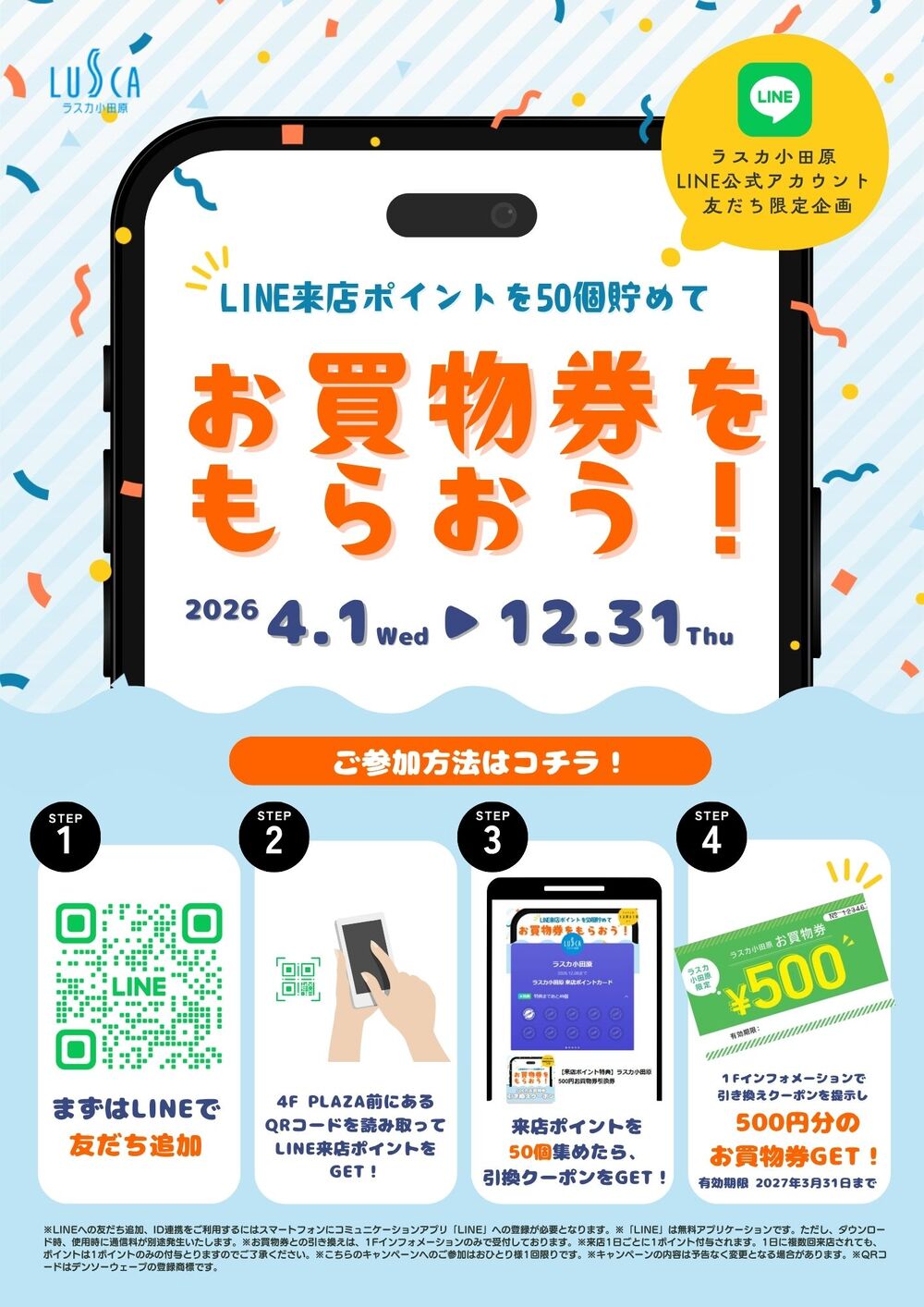 <ラスカ小田原LINE公式アカウント限定>LINE来店ポイントを50個貯めて、お買物券をもらおう!